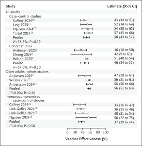 Trong số 17.263 tài liệu tham khảo đã được xác định, 511 nghiên cứu đáp ứng các tiêu chí lựa chọn. Vắc-xin mRNA Covid-19 chống lại biến thể phụ XBB.1.5 có hiệu quả gộp về khả năng phòng ngừa nhập viện là 46% (khoảng tin cậy 95% [CI], 34 đến 55; từ các nghiên cứu đoàn hệ) và 50% (CI 95%, 43 đến 57; từ các nghiên cứu ca-chứng) ở người lớn và 37% (CI 95%, 29 đến 44) ở người lớn suy giảm miễn dịch. Trong một nghiên cứu ca-chứng, vắc-xin chống lại biến thể phụ KP.2 cho thấy hiệu quả là 68% (CI 95%, 42 đến 82). Vắc-xin RSV cho mẹ (để bảo vệ trẻ sơ sinh), nirsevimab cho trẻ sơ sinh và vắc-xin RSV cho người lớn từ 60 tuổi trở lên cho thấy hiệu quả phòng ngừa nhập viện là 68% trở lên. Vắc-xin cúm có hiệu quả vắc-xin gộp là 48% (95% CI, 39 đến 55) ở người lớn từ 18 đến 64 tuổi và 67% (95% CI, 58 đến 75) ở trẻ em so với việc phải nhập viện. Hồ sơ an toàn phù hợp với các đánh giá trước đây. Chẩn đoán viêm cơ tim liên quan đến vắc-xin Covid-19 xảy ra với tỷ lệ từ 1,3 đến 3,1 trên 100.000 liều ở nam thanh thiếu niên, với nguy cơ thấp hơn liên quan đến khoảng cách liều dài hơn. Vắc-xin RSVpreF có liên quan đến 18,2 trường hợp mắc hội chứng Guillain-Barré thừa trên một triệu liều ở người lớn tuổi; không thấy mối liên quan đáng kể nào với sinh non khi vắc-xin được tiêm ở tuần thứ 32 đến 36 của thai kỳ.
