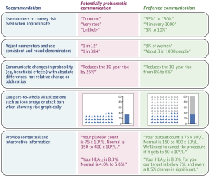 Đầu tiên, nên sử dụng các con số (kể cả gần đúng) để mô tả xác suất rủi ro. Ý nghĩa của các thuật ngữ xác suất bằng lời nói (ví dụ: hiếm, phổ biến hoặc không có khả năng xảy ra) khác nhau tùy theo từng người và từng tình huống. Một đánh giá có hệ thống về 24 nghiên cứu cho thấy mọi người hiểu “hiếm” có nghĩa là xác suất từ ​​0% đến 80%, trong khi cách hiểu về “phổ biến” dao động từ 10% đến 100%. Việc sử dụng các con số giúp bệnh nhân hiểu liệu nguy cơ hiếm gặp là 4% hay 0,004%. Trong một đánh giá có hệ thống lớn, các thuật ngữ xác suất bằng lời nói dẫn đến nhận thức về khả năng xảy ra là lớn hơn (7 trong số 9 nghiên cứu; N = 2972) và mạnh hơn (8 trong số 10 nghiên cứu; N = 3002) tác động đến ý định hành vi so với các con số. Hơn nữa, 8 nghiên cứu (N = 5079) cho thấy hầu hết mọi người thích nhận thông tin về rủi ro sức khỏe ở dạng số hoặc dạng số cộng với dạng lời nói hơn là chỉ dạng lời nói. Một lưu ý đối với khuyến nghị này là giao tiếp không phải dạng số có thể phù hợp khi bệnh nhân hiểu một danh mục (ví dụ: rủi ro của họ là “cao”) quan trọng hơn là khả năng xảy ra chính xác.