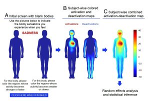 Ở đây, chúng tôi tiết lộ bản đồ các cảm giác cơ thể liên quan đến các cảm xúc khác nhau bằng phương pháp tự báo cáo địa hình độc đáo. Trong năm thí nghiệm, những người tham gia (n = 701) được cho xem hai hình bóng của cơ thể bên cạnh những từ ngữ, câu chuyện, phim ảnh hoặc biểu cảm khuôn mặt mang tính cảm xúc. Họ được yêu cầu tô màu các vùng cơ thể mà họ cảm thấy hoạt động tăng lên hoặc giảm xuống khi xem từng kích thích.