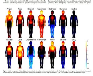Các cảm xúc khác nhau luôn được liên kết với các bản đồ cảm giác cơ thể có thể tách biệt về mặt thống kê trong suốt các thí nghiệm. Những bản đồ này phù hợp với các mẫu ở Tây Âu và Đông Á.